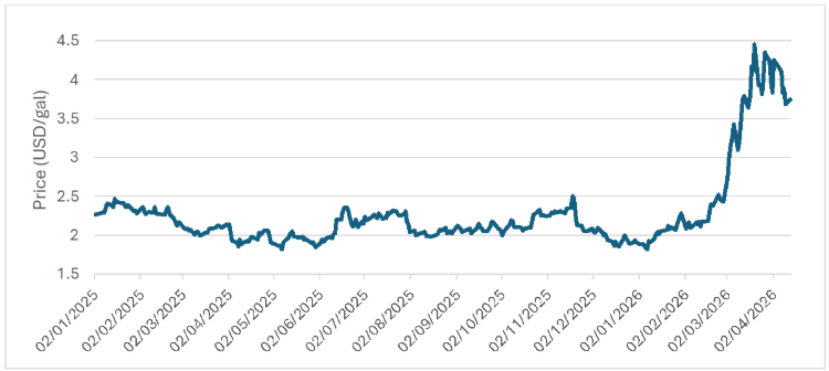 Figure 1: U.S. Gulf Coast Kerosene-Type Jet Fuel Spot Price FOB, starting January 2025 (source: U.S. EIA)